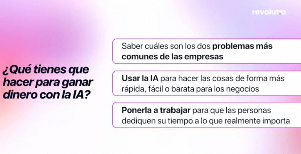 Revolutia es una formación en inteligencia artificial orientada, no a enseñarte teoría, sino a que puedas ganar dinero con la IA lo antes posible. Su propuesta de valor es directa: el mercado tiene más empresas con problemas que personas capaces de resolverlos usando IA. Tú eres esa persona. Ellos te enseñan cómo.